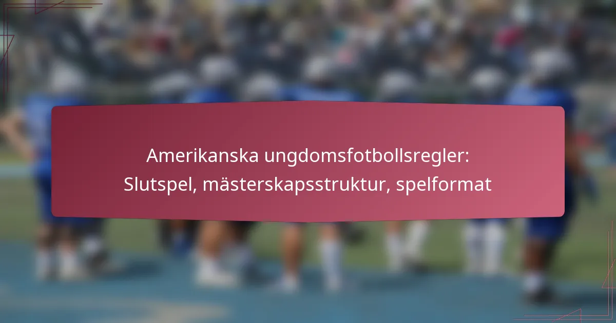Amerikansk ungdomsfotboll styrs av en blandning av nationella, statliga och ligaspecifika regler som främjar rättvist spel och säkerhet. Slutspelsstrukturen består vanligtvis av utslagningar som kulminerar i en mästerskapsmatch, med variationer beroende på lokala ligaregler. Dessutom skiljer sig mästerskapsformaten åt beroende på region och åldersgrupp, men de syftar konsekvent till att avgöra de bästa lagen i slutet av säsongen.